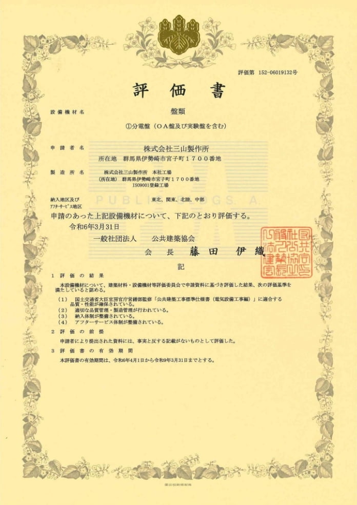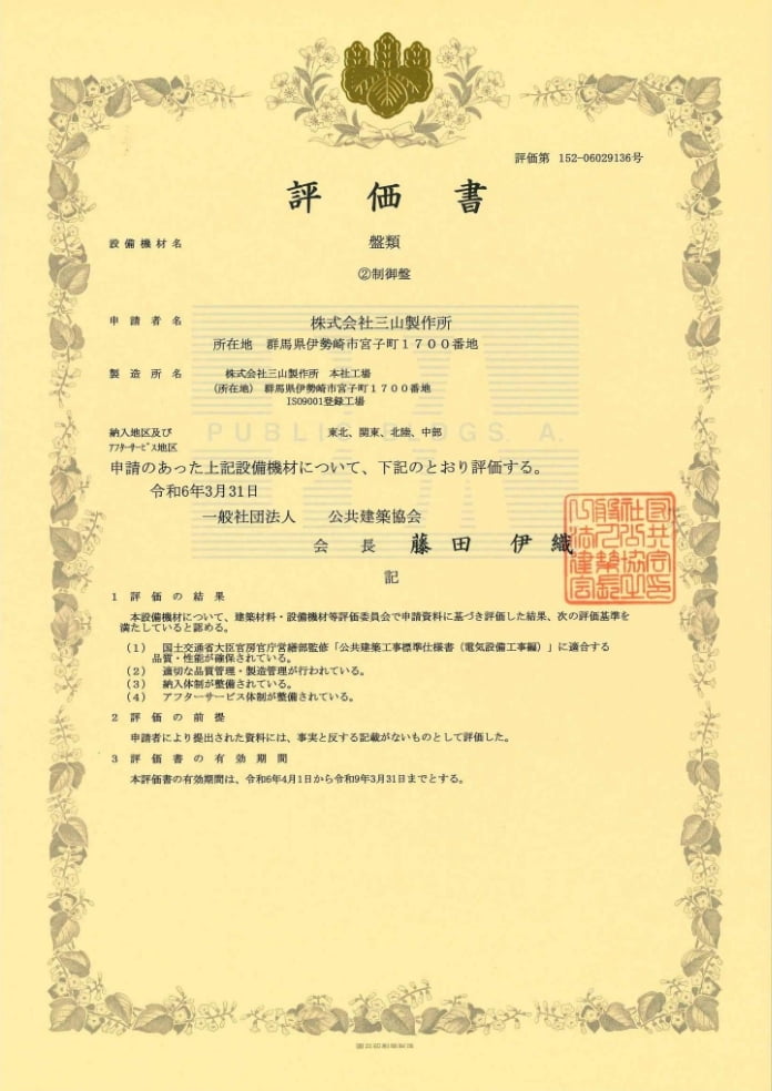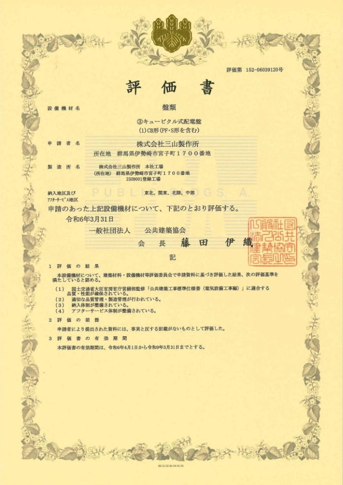 公共建築協会 盤類③キュービクル式配電盤の評価を取得。キュービクル式配電盤について、公共事業向けの製作が可能となる。
