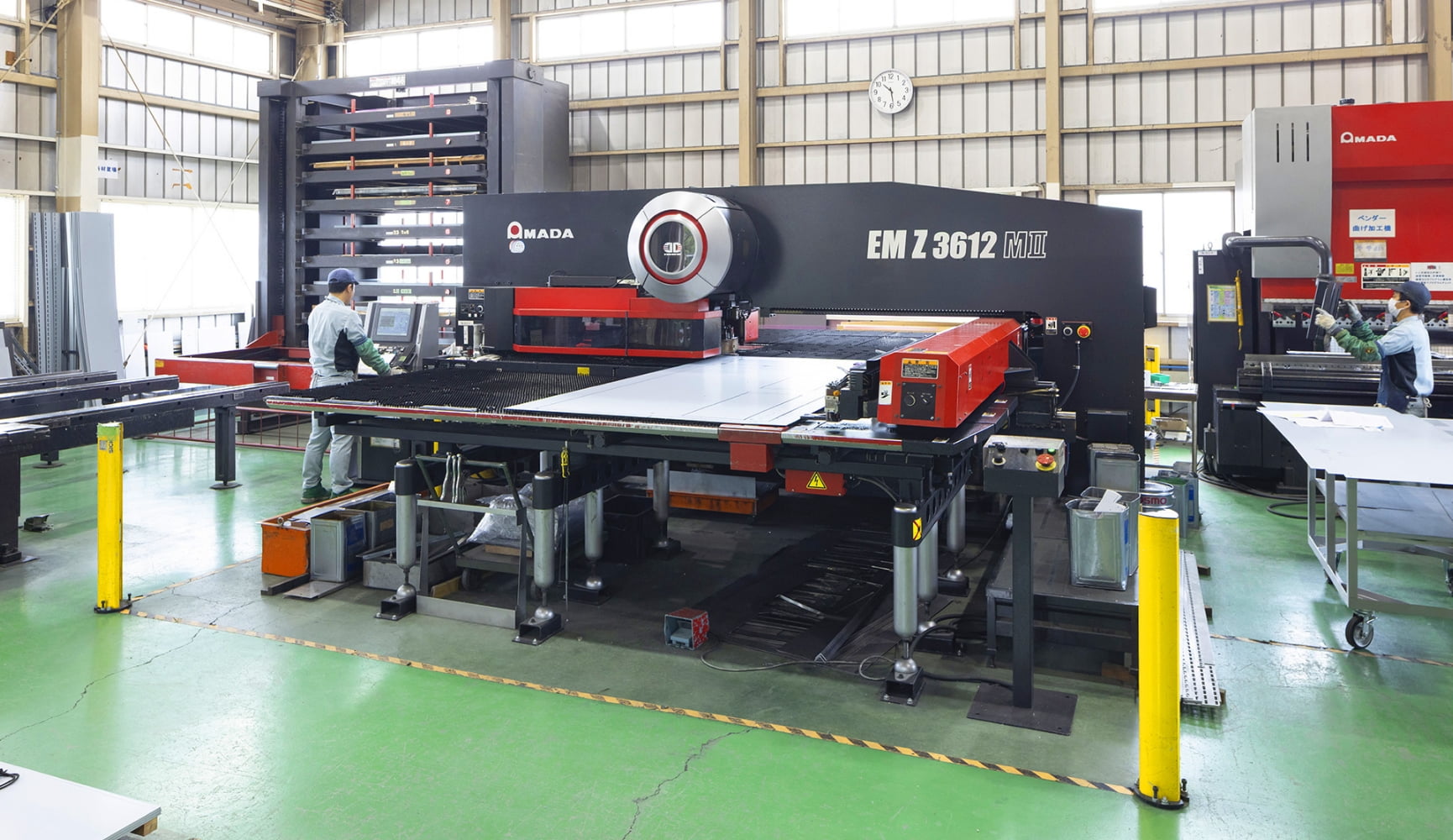 アマダのEMZ3612MⅡは、高性能なタレットパンチプレスで、金属板材への打抜き、成形、タッピング加工などを高速・高精度に行える工作機械です。