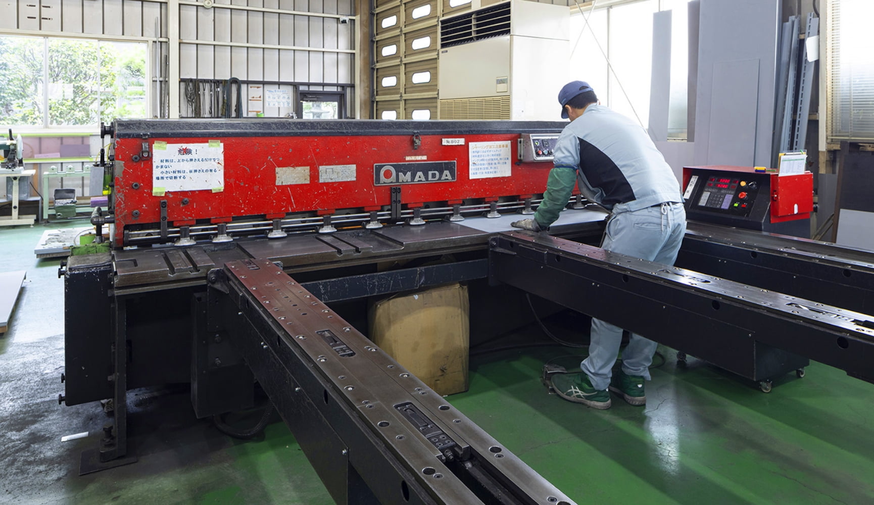 アマダのNCシャーリングマシンは、金属板材を高精度に切断する工作機械です。